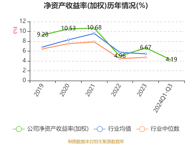 盈利能力方面, 2024年前三季度公司加权平均净资产收益率为4.19%,同比下降0.29个百分点。
