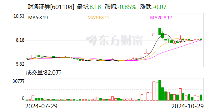 财通证券(601108)10月30日披露2024年第三季度报告。前三季度公司实现营业收入44.41亿元,同比下降10.36%;归母净利润14.72亿元,同比下降1.93%;扣非净利润13.89亿元,同比下降2.10%;经营活动产生的现金流量净额为181.25亿元,上年同期为-26.95亿元;报告期内,财通证券基本每股收益为0.32元,加权平均净资产收益率为4.19%。公司2024年前三季度分配预案为:拟向全体股东每10股派现0.5元(含税)。