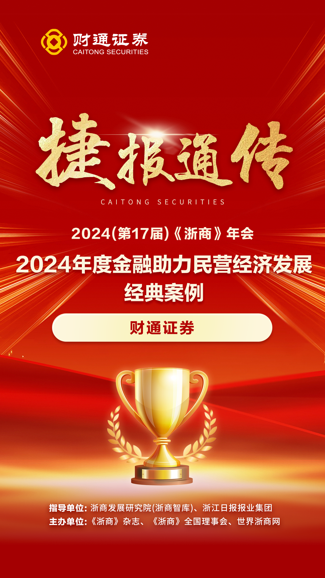 2024年是“金融强国”与“五篇大文章”提出后首个完整财年,也是金融业贯彻中央金融工作会议精神,以高质量金融服务为实体经济赋能的元年。浙江日报报业集团《浙商》杂志的“2024年度金融助力民营经济发展经典案例”评选,携手省内外各大金融机构一道,表彰和宣传在支持民营经济发展、创新金融服务模式、提升金融服务质量等方面,作出突出贡献的金融机构。此次获奖,彰显了业内同行和媒体朋友对财通的认可与支持。