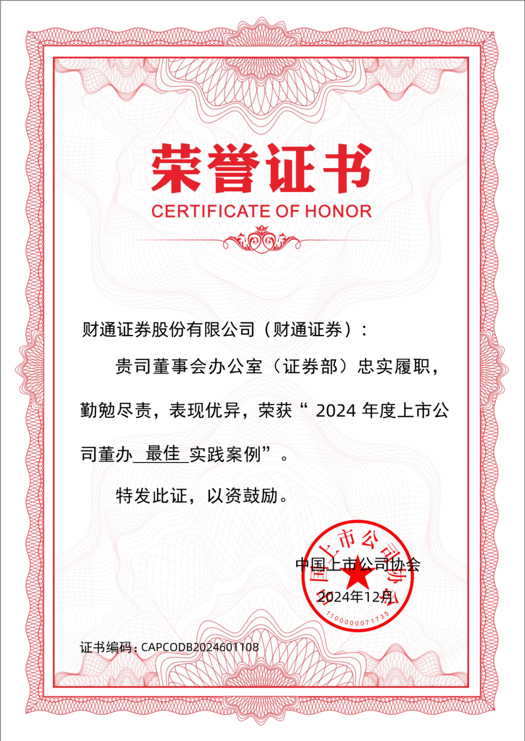 近日,中国上市公司协会(以下简称“中上协”)发布“2024上市公司董办最佳实践”案例评选结果,财通证券入选“2024上市公司董办最佳实践案例”。这是财通证券连续第二年入选“董办最佳实践案例”,体现了资本市场对公司规范运作、公司治理、信息披露及投资者关系管理等工作的广泛认可。
