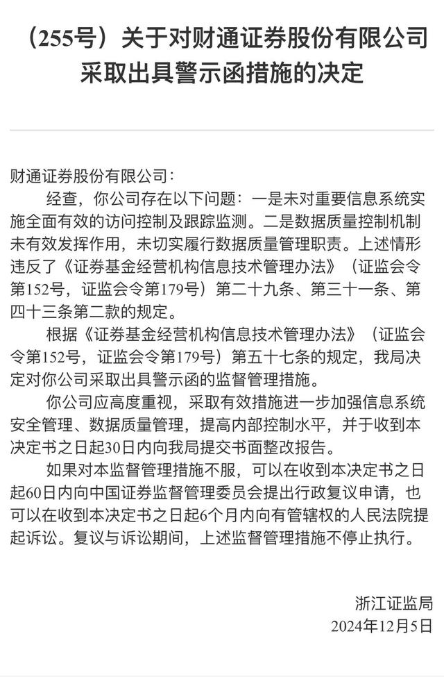 具体来说,据浙江证监局披露,经查,财通证券存在两项问题:一是未对重要信息系统实施全面有效的访问控制及跟踪监测。二是数据质量控制机制未有效发挥作用,未切实履行数据质量管理职责,由于违反相关规定,浙江证监局对财通证券出具警示函。