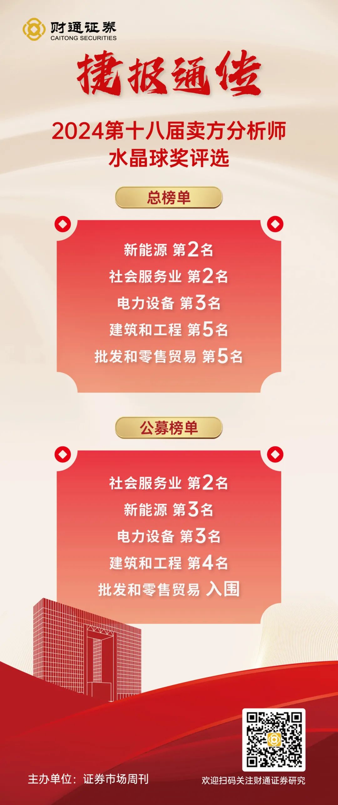 在公募榜单中,财通证券摘得社会服务业第2名、新能源行业第3名、电力设备行业第3名、建筑和工程行业第4名,批发和零售贸易行业入围。