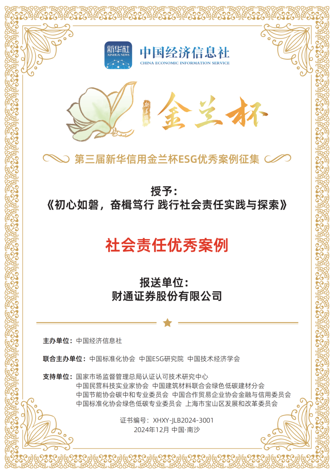 新华信用金兰杯ESG优秀案例征集活动由中国经济信息社发起,至今已连续举办三届,得到国内外各领域各行业的广泛关注,已形成全领域多行业的企业绿色低碳与ESG案例库。本次新华信用金兰杯征集案例涵盖各类主题,最终评选出“十大”ESG优秀案例和百家ESG优秀案例。此次获评不仅彰显了财通证券在可持续发展领域的深耕实力,也体现了行业对财通证券在践行ESG理念上的认可。