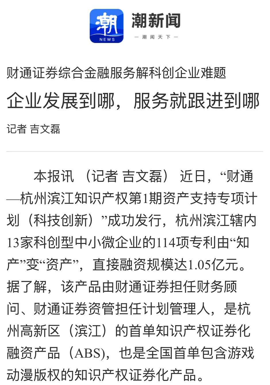 本报讯(记者吉文磊)近日,“财通—杭州滨江知识产权第1期资产支持专项计划(科技创新)”成功发行,杭州滨江辖内13家科创型中小微企业的114项专利由“知产”变“资产”,直接融资规模达1.05亿元。据了解,该产品由财通证券担任财务顾问、财通证券资管担任计划管理人,是杭州高新区(滨江)的首单知识产权证券化融资产品(ABS),也是全国首单包含游戏动漫版权的知识产权证券化产品。