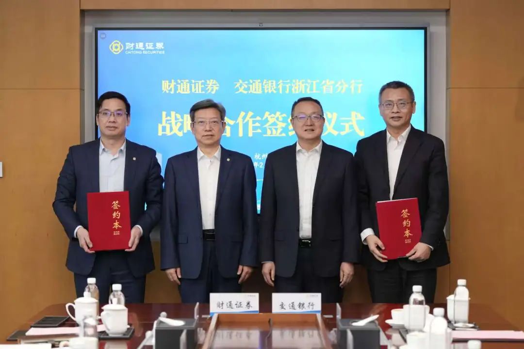 2月17日下午,财通证券与交通银行浙江省分行签署战略合作协议。财通证券党委书记、董事长章启诚,交通银行浙江省分行党委书记、行长陈俊出席签约仪式,财通证券党委委员、监事会主席叶笃银与交通银行浙江省分行党委委员、副行长季建友代表双方签署战略合作协议。财通证券、交通银行浙江省分行相关部门负责人参加签约仪式。