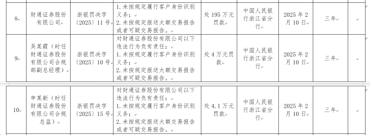 2月17日,中国人民银行浙江分行公布行政处罚决定,财通证券(601108)因未按规定履行客户身份识别义务、未报送大额交易或可疑交易报告,被处以195万元罚款,成为2025年新修订《反洗钱法》实施后首家被罚的券商。同时,其时任合规总监申某新、合规部副总经理吴某霞分别被罚款4.1万元和4万元。