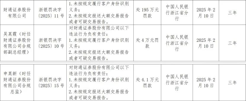 近日,财通证券因未按规定履行客户身份识别义务,未按规定报送大额交易报告或者可疑交易报告,被处195万元罚款,并公示三年。同时,财通证券两名相关责任人也被予以罚款。