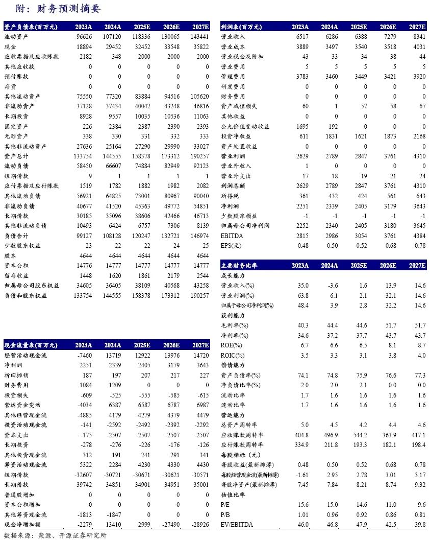 2024年公司营业总收入/归母净利润为62.9/23.4亿元,同比-4%/+4%,符合我们预期,加权平均ROE6.59%,同比-0.08pct,权益乘数(扣客户保证金)3.22倍,同比-0.1倍。2025Q1营业总收入/归母净利润为10.7/2.9亿元,同比-24%/-37%,一季报低于我们预期,年化加权平均ROE3.16%,同比-2.1pct。一季度自营投资收益同比下降拖累业绩,预计受债市走弱影响。考虑公司自营投资收益低于我们预期,下调2025、2026年归母净利润预测至24/32亿元(调前28/34),新增2027年预测36亿元,同比+3%/+32%/+15%,ROE6.5%/8.1%/8.7%,EPS为0.5/0.7/0.8元。公司区位优势突出,母公司财富管理持续改善,子公司支撑ROE。当前股价对应PB 0.9/0.9/0.8倍,维持“买入”评级。
