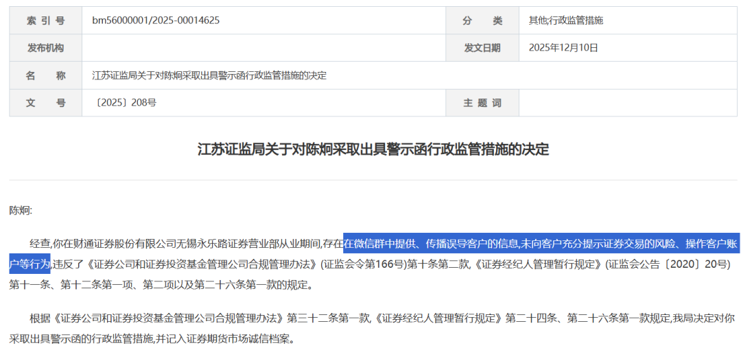 依据《证券公司和证券投资基金管理公司合规管理办法》《证券经纪人管理暂行规定》相关规定,江苏证监局对其采取出具警示函的监管措施,并记入证券期货市场诚信档案。