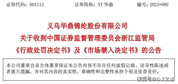 2021年10月13日,ST华鼎(601113)公告公司收到中国证监会浙江监管局的《行政处罚决定书》(【2021】18号)及《市场禁入决定书》(【2021】5号)。