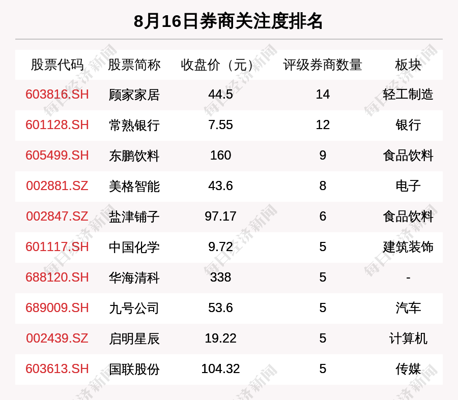 8月16日,券商给予评级的个股数共有134只,获得买入评级的个股数共有104只。在公布了目标价格的37只个股中,按照最新收盘价计算,预期涨幅排名居前的个股是中国化学(601117.SH)、兰剑智能(688557.SH)、星源材质(300568.SZ),预期涨幅分别是66.87%、58.42%、52%。