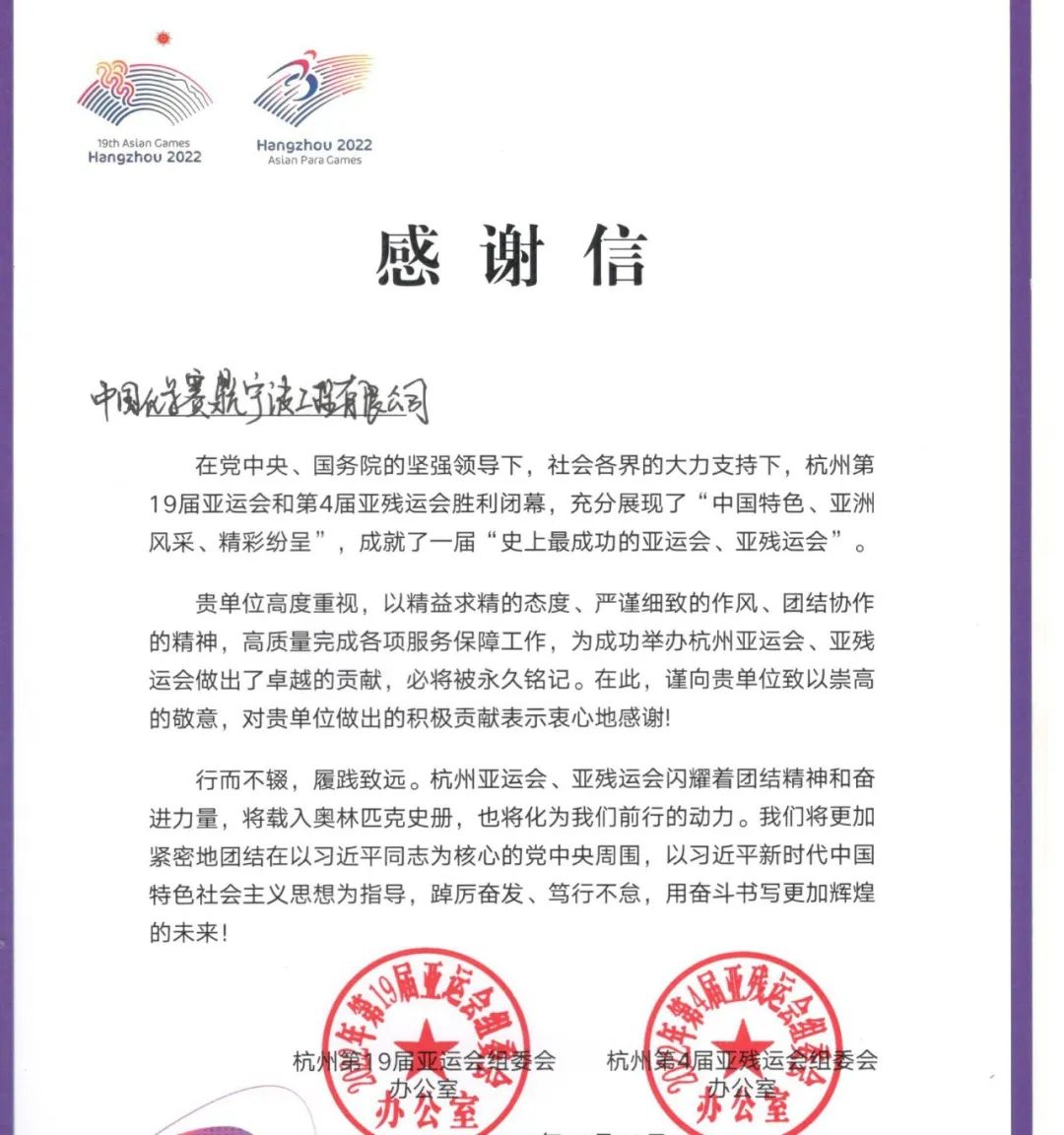 近日,中国化学所属赛鼎宁波公司收到杭州第19届亚运会和第4届亚残运会组委会的感谢信,感谢赛鼎宁波公司以精益求精的态度、严谨细致的作风、团结协作的精神,高质量完成各项服务保障工作,为国家成功举办杭州亚运会、亚残运会做出了卓越贡献。