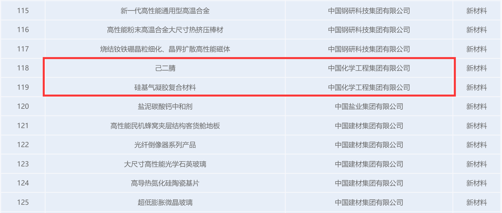 环球聚氨酯网讯:近日,国务院国资委发布《中央企业科技创新成果产品手册(2023年版)》,中国化学己二腈、硅基气凝胶复合材料两项技术产品成功入选。