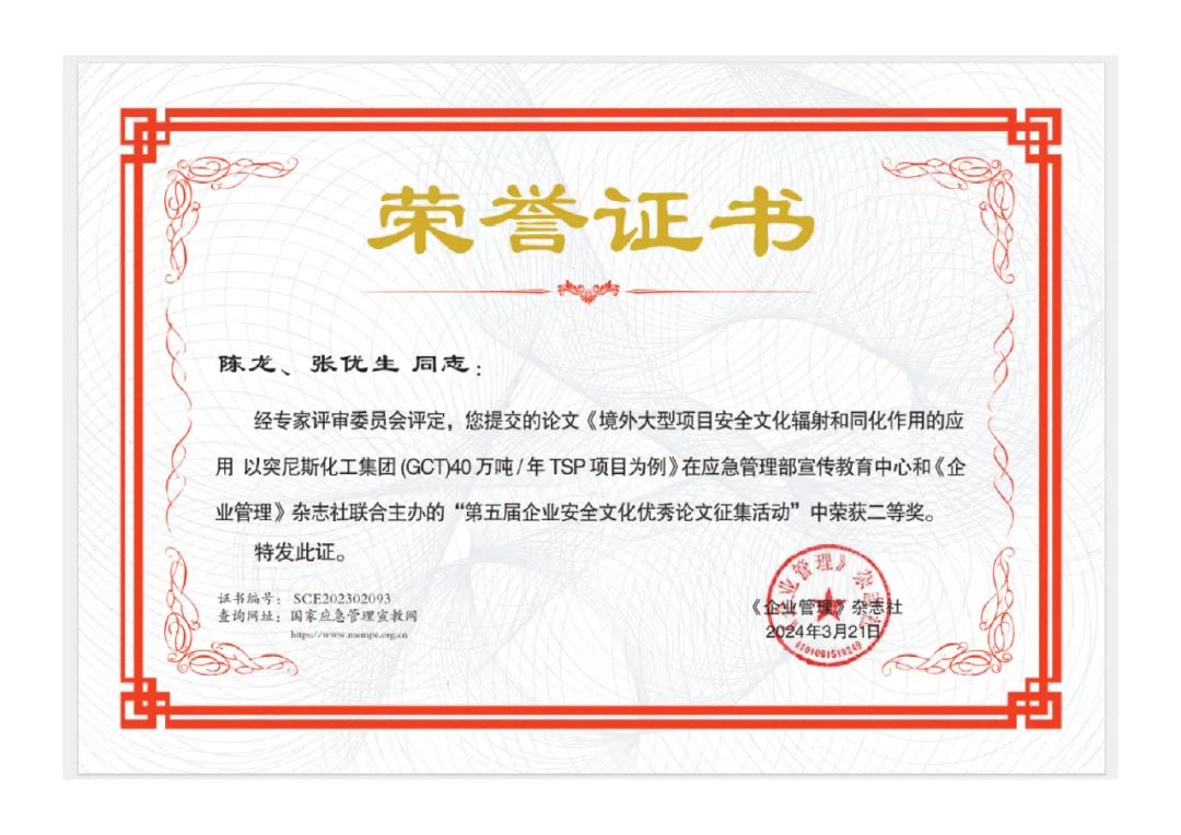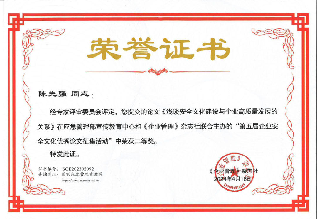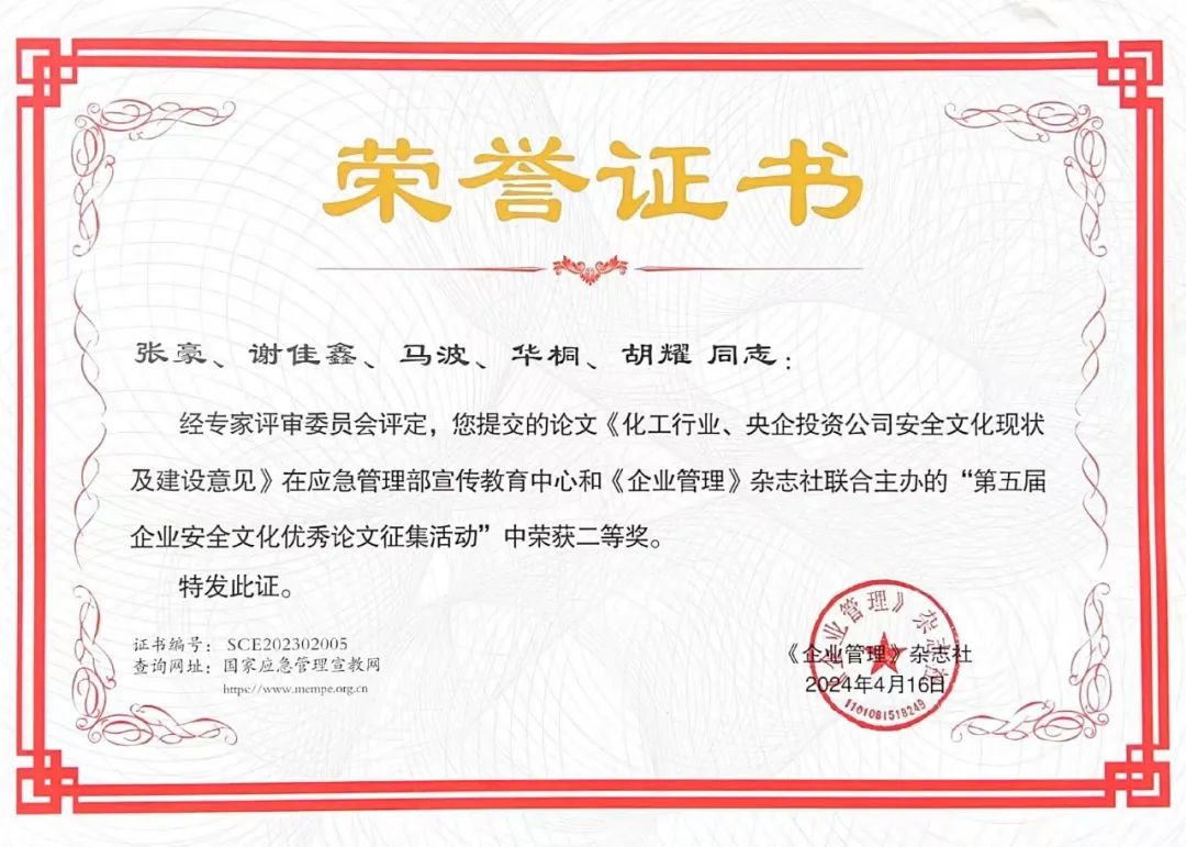 同时,上述获奖论文在人民日报《新安全》杂志社和国务院国资委社会责任局“央企安全管理”主题征文中荣获“优秀奖”,后续还将被收录于《第五届全国企业安全文化优秀论文集》出版发行。