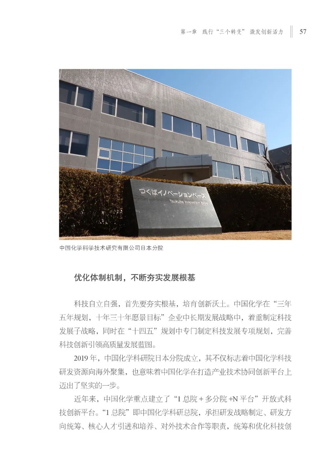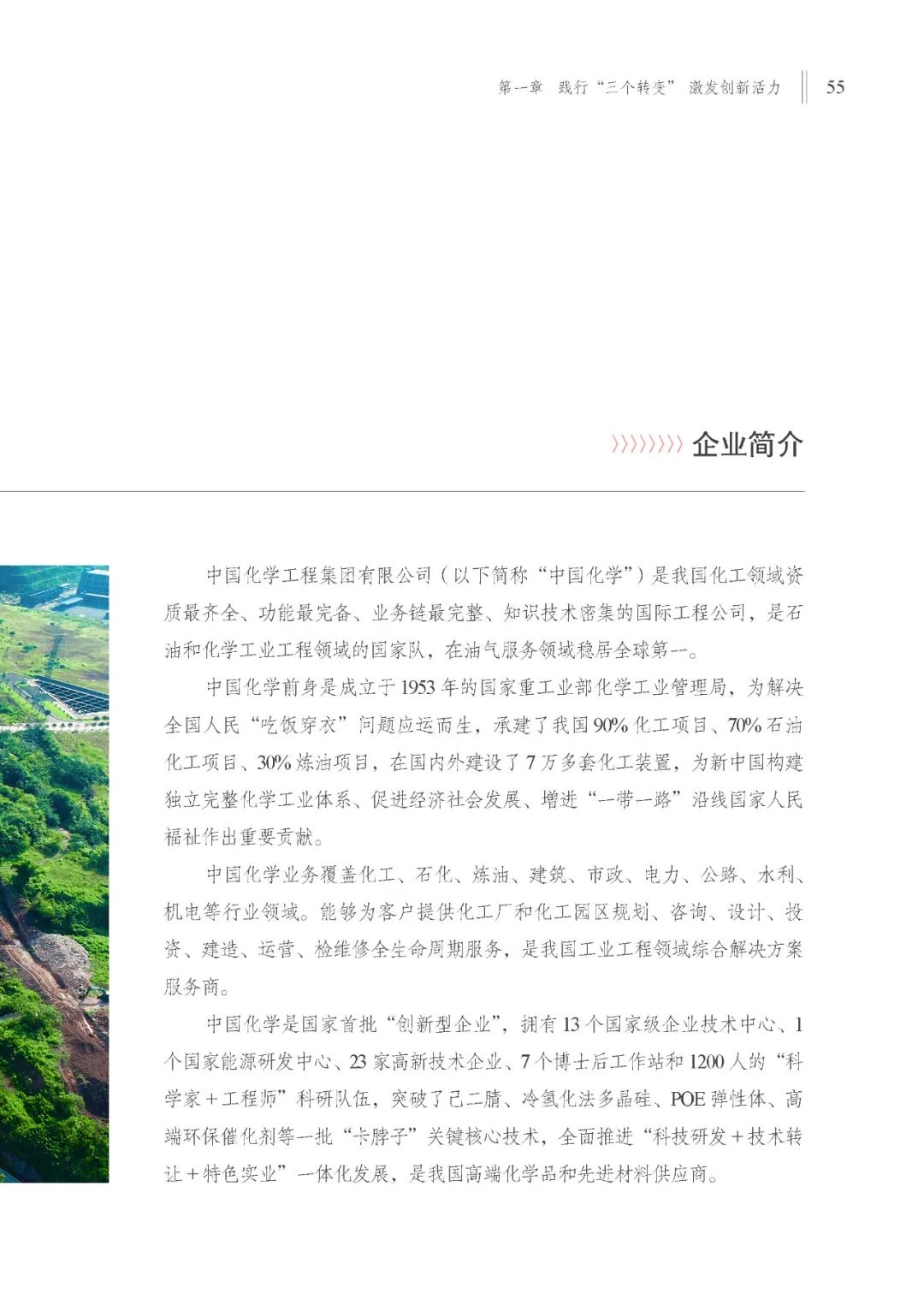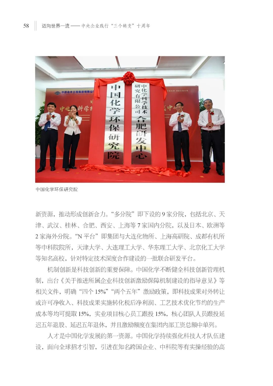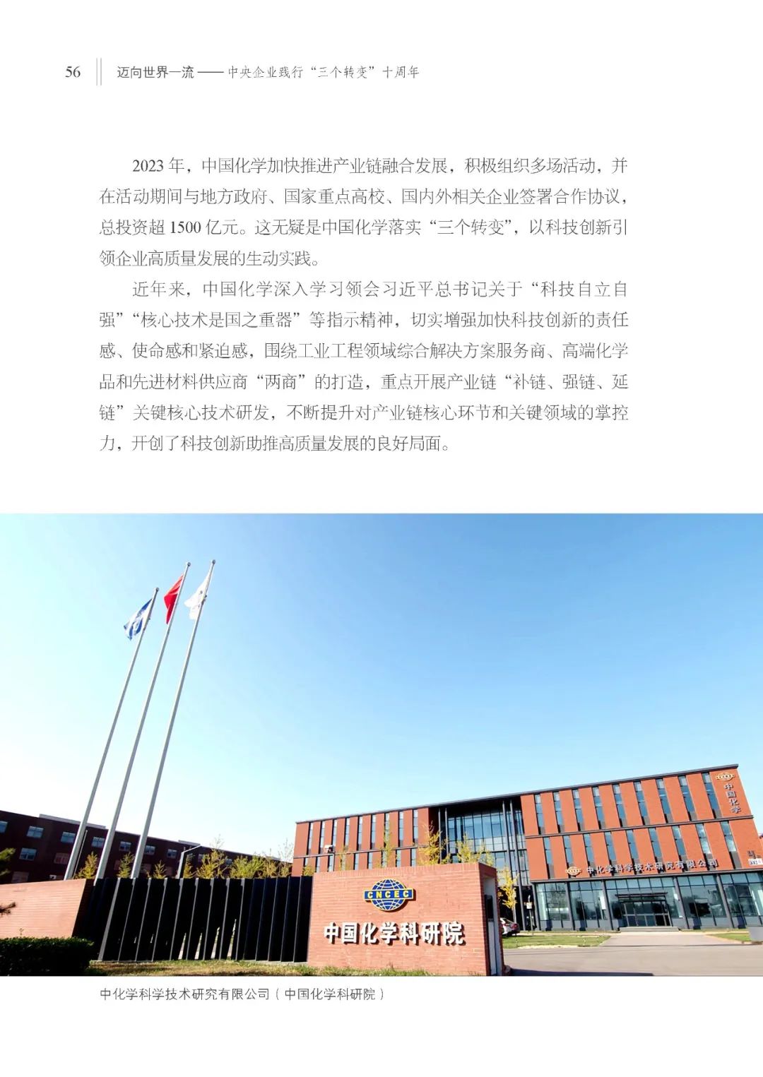 书中第一个篇章以《中国化学:加快打造“两商”塑造高质量发展新动能》为题,从“优化体制机制,不断夯实发展根基”“聚焦关键技术,打造优势实业技术”“响应国家战略,推动产业绿色发展”三个方面介绍了中国化学作为中央企业,以实际行动贯彻落实“三个转变”重要指示精神,以科技创新引领打造世界一流品牌的具体实践。主要内容如下:
