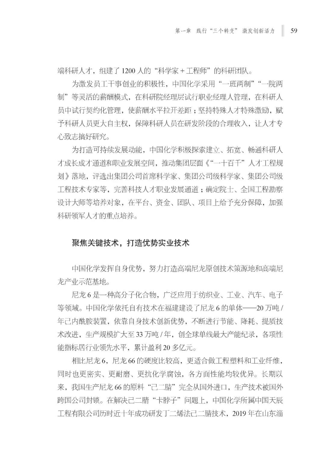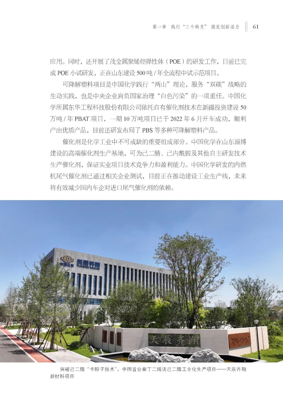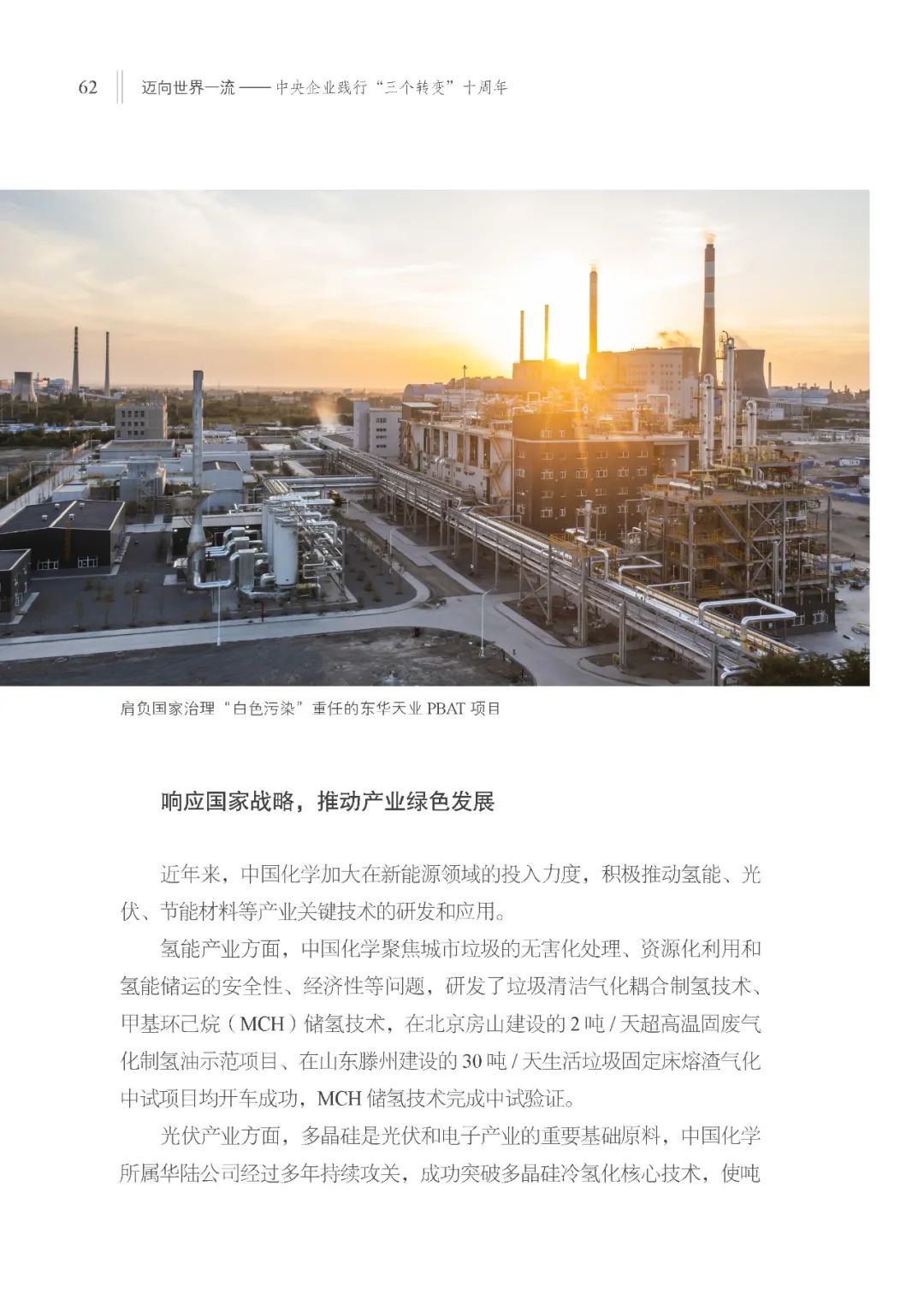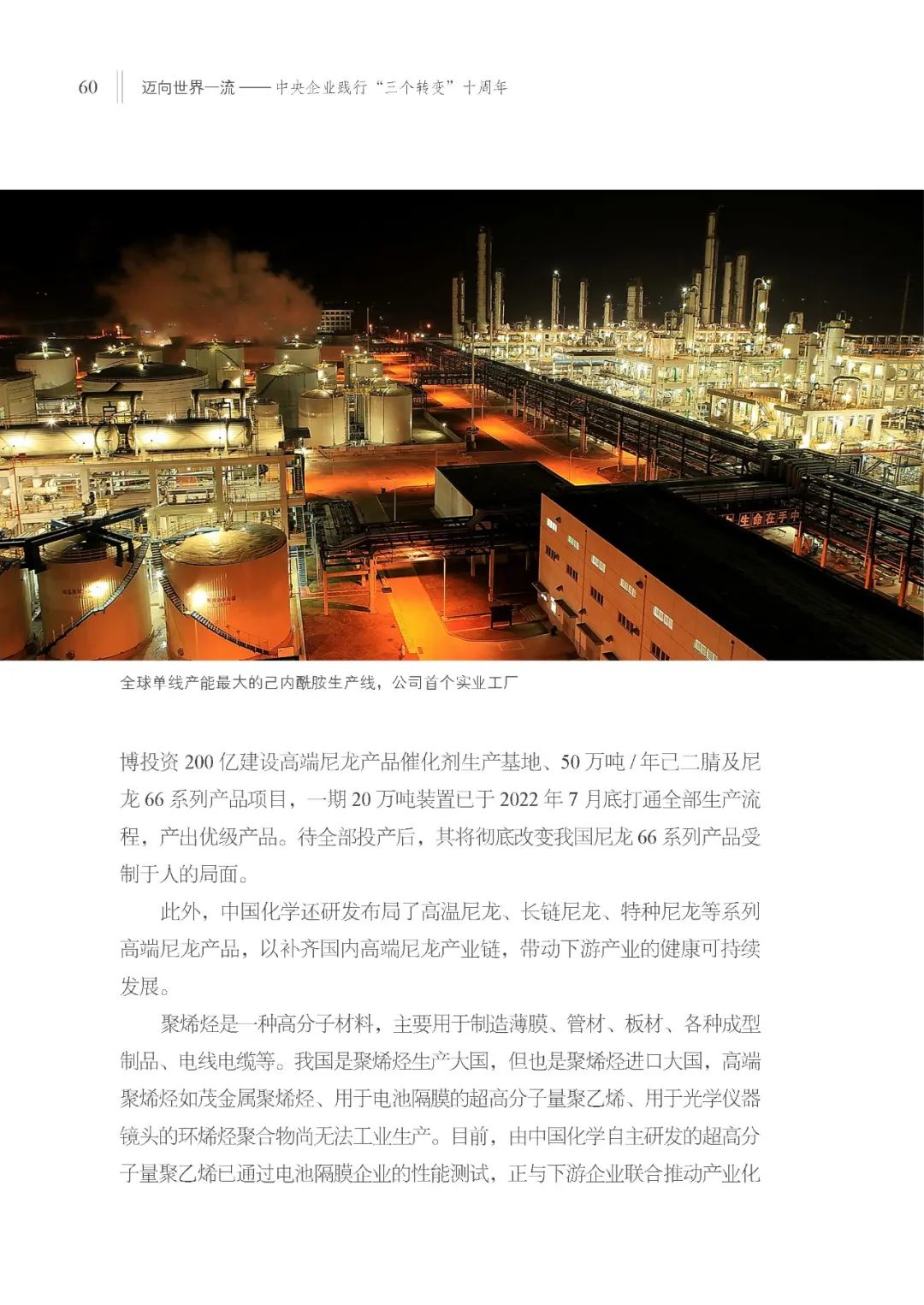 书中第一个篇章以《中国化学:加快打造“两商”塑造高质量发展新动能》为题,从“优化体制机制,不断夯实发展根基”“聚焦关键技术,打造优势实业技术”“响应国家战略,推动产业绿色发展”三个方面介绍了中国化学作为中央企业,以实际行动贯彻落实“三个转变”重要指示精神,以科技创新引领打造世界一流品牌的具体实践。主要内容如下: