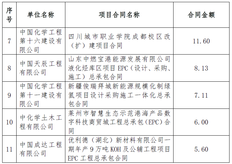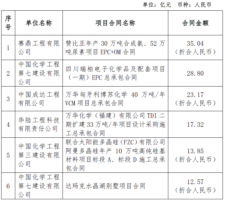 3 月,公司单笔合同额在人民币 5 亿元以上的重大合同主要有6笔,其中有万华化学(福建)有限公司 MDI 一体化气体扩能改造项目废水处理装置工程废水处理装置工程及厂外4#管廊(不含土建,结构)设计采购施工总承包合同,该合同金额7.63亿元。