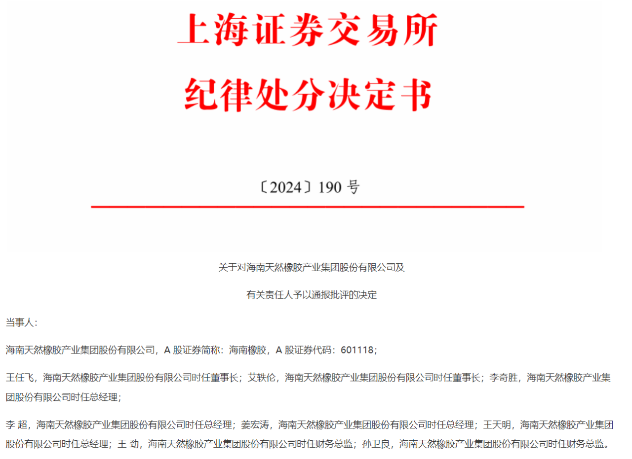 对海南天然橡胶产业集团股份有限公司及时任董事长王任飞、艾轶伦,时任总经理李奇胜、李超、姜宏涛、王天明,时任财务总监王劲、孙卫良予以通报批评。对于上述纪律处分,交易所将通报中国证监会,并记入上市公司诚信档案。