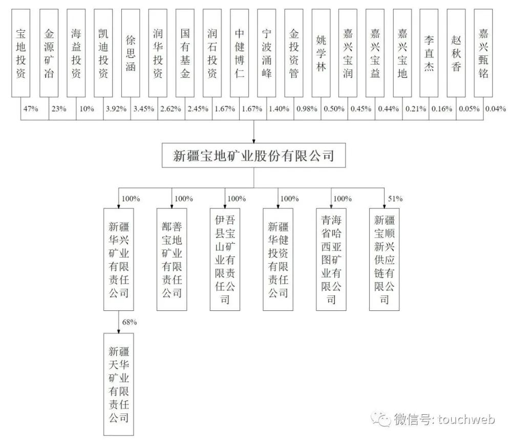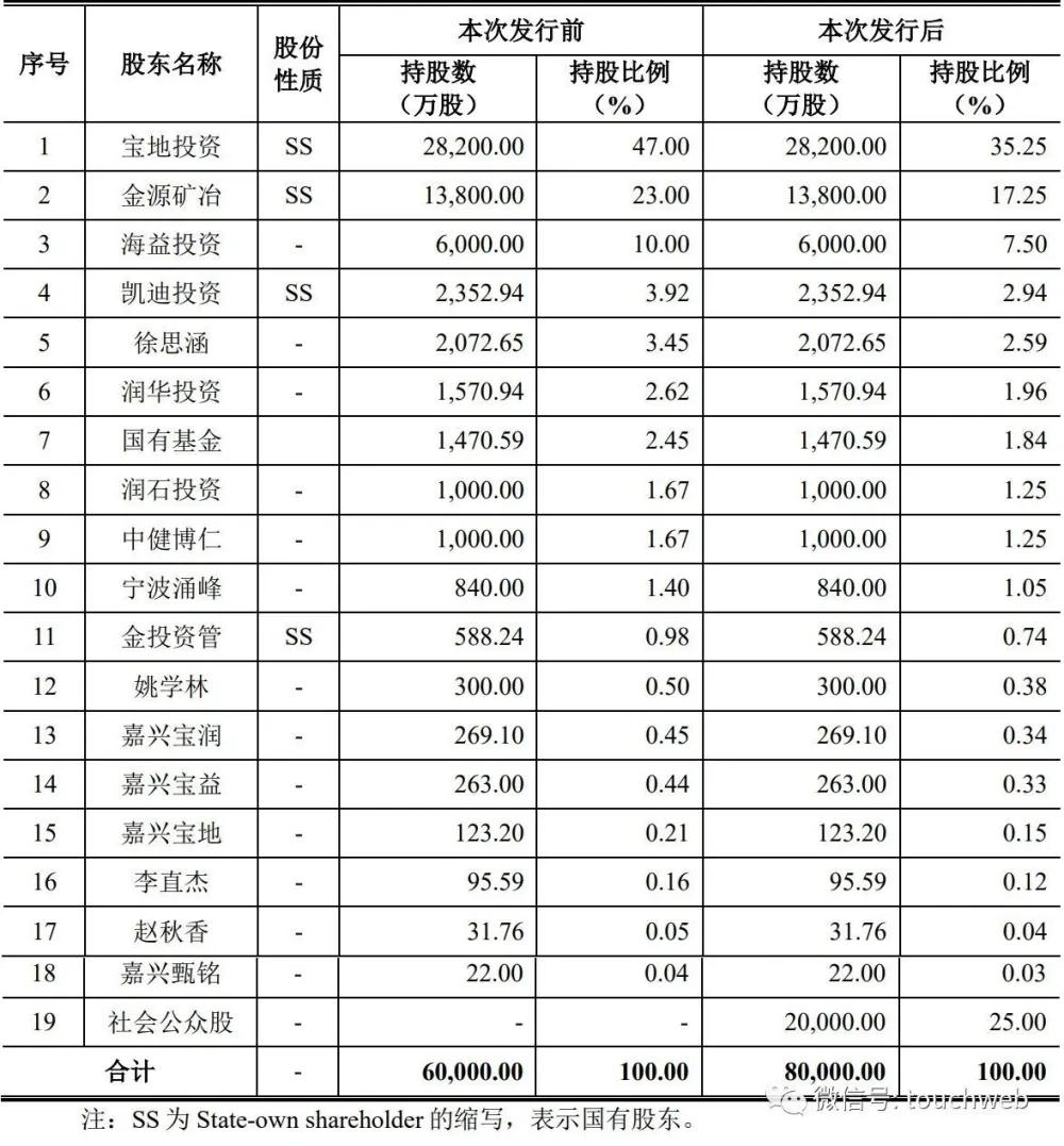 IPO后,宝地投资持股为35.25%,金源矿冶持股为17.25%,海益投资持股为7.5%,凯迪投资持股为2.94%,徐思涵持股为2.59%,润华投资持股为1.96%,国有基金持股为1.84%,润石投资、中健博仁分别持股为1.25%;