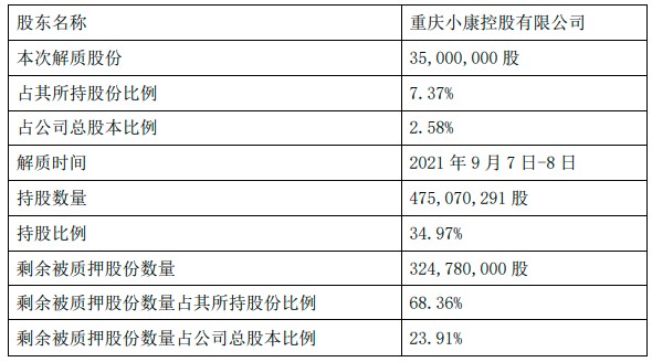 本次部分股票解除质押后,小康控股累计质押股票数为约3.25亿股,占其持有公司股份总数的68.36%,占公司总股本的23.91%。