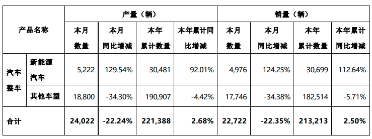 11月3日,小康股份(SH601127)公告,新能源汽车10月销量为4976辆,同比增加124.25%,前10月累计销量约3.07万辆,同比增加112.64%;汽车整车10月合计销量约2.27万辆,同比减少22.35%,前十月合计销量约21.32万辆,同比增加2.5%。
