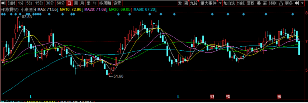 反观小康股份股价,却从今年3月初的19.20元/股,一路飙涨至6月份的最高83.83元/股,最大涨幅超过300%,之后进入长达半年的横盘整理状态。