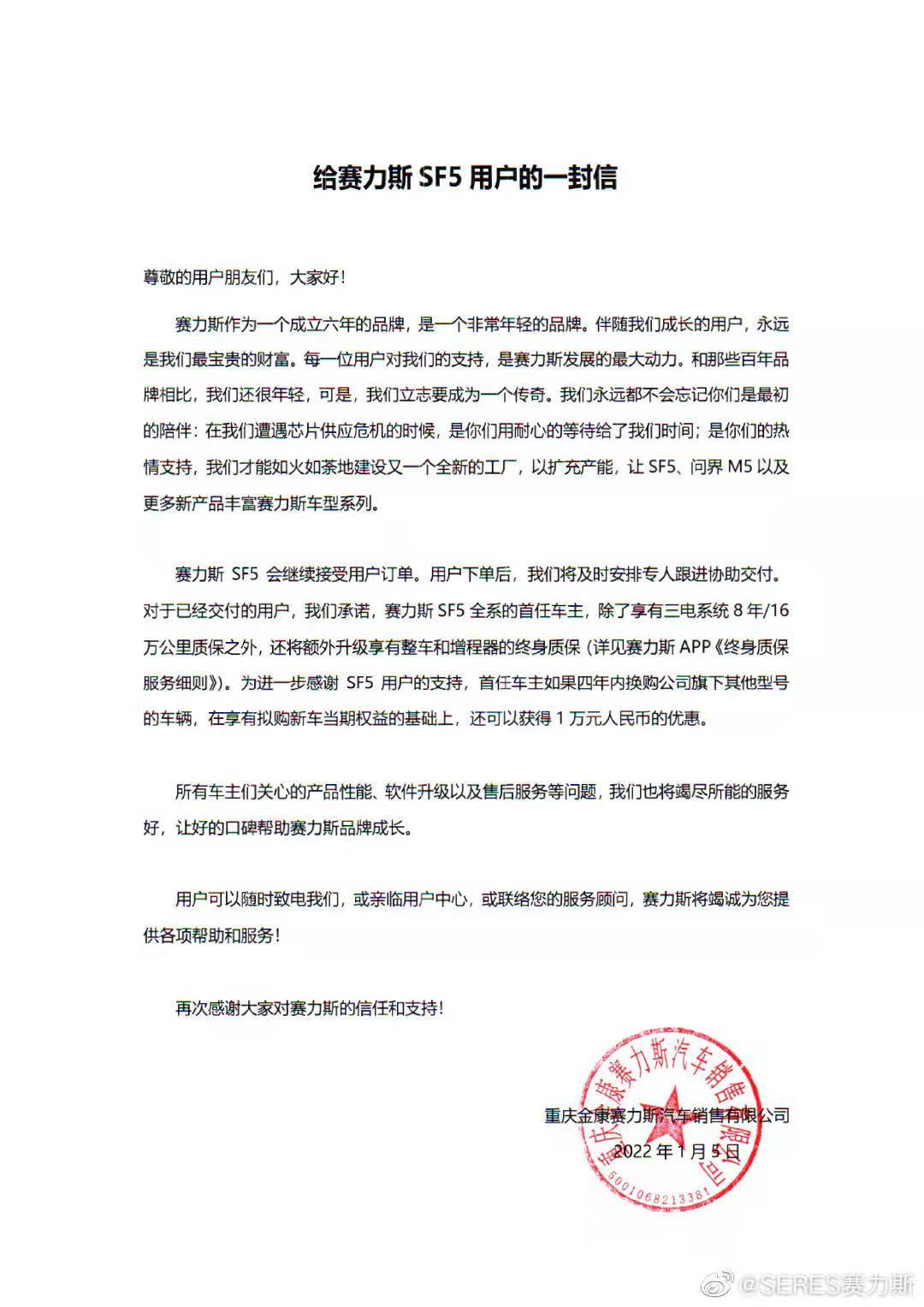 “对于已经交付的用户,我们承诺,赛力斯SF5全系的首任车主,除了享有三电系统8年/16万公里质保之外,还将额外升级享有整车和增程器的终身质保。”信中表示。