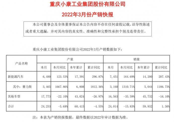 值得注意的是,小康股份首次单独披露了旗下新能源汽车品牌赛力斯的产销情况。3月,赛力斯产销分别为3465辆和3160辆,同比增长1667.86%和1310.71%;今年一季度,赛力斯累计产销分别为6808辆和5044辆,增幅分别为1812.36%和1186.73%。