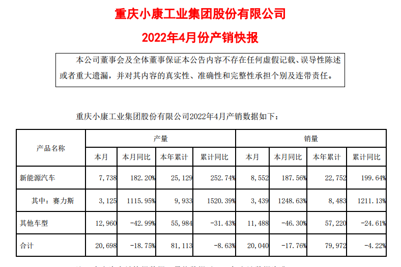 中国网汽车5月23日讯(记者王忆东)前不久,小康股份发布了4月份的产销数据,记者注意到,该公司旗下新能源汽车及其他车型在产销方面的数据差异有进一步扩大的趋势。根据数据显示,今年4月份,小康股份新能源汽车产量为7738辆,同比增长182.20%。销量8552辆,同比增长187.56%。其中增长最为明显的属旗下赛力斯品牌,4月份产量3125辆,同比增长1115.95%,销量3439辆,同比增长高达1248.63%。其今年1-4月累计产销同比也超过了1000%。