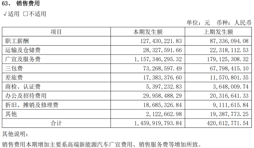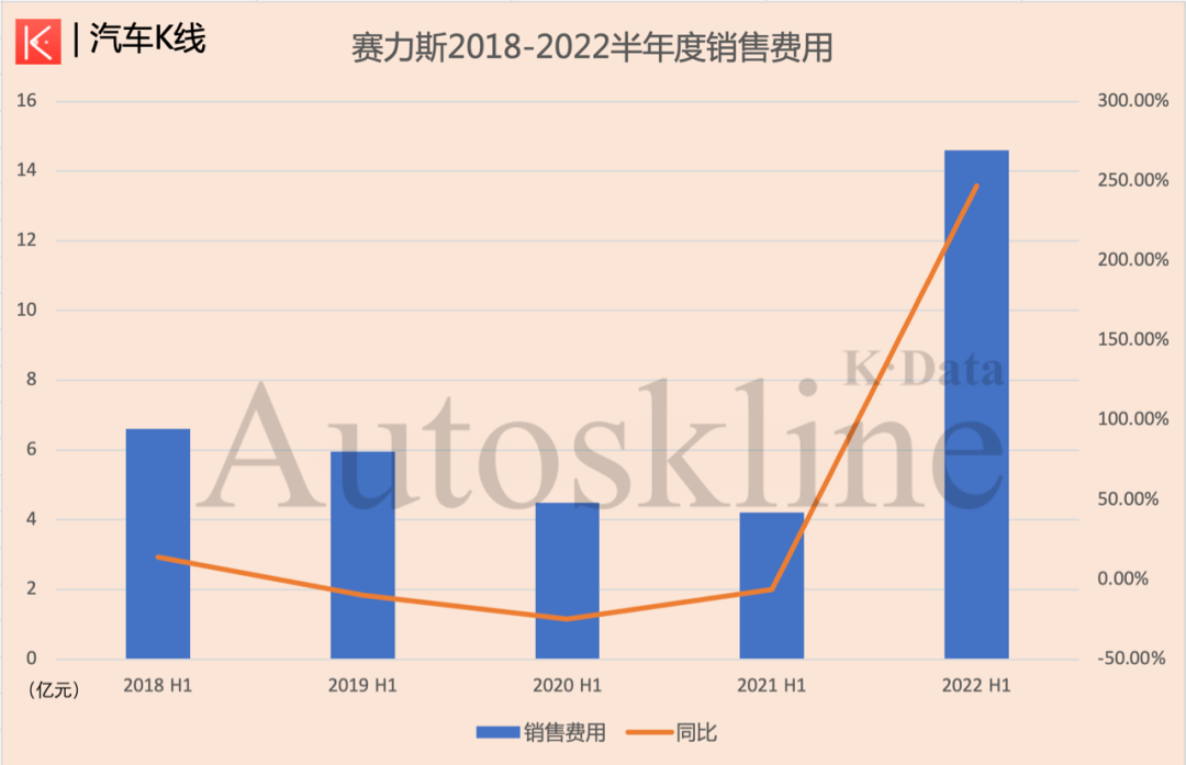 首先看销售费用。财报显示,赛力斯2022上半年销售费用同比上年同期大增247.09%,达到14.6亿元。也就是说,和今年相比,上年同期的销售费用都不到一个零头。