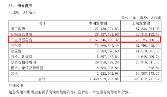 2022年上半年,赛力斯的销售费用高达14.59亿元,同比大增247.09%,占营收比例为11.75%,比研发费用的占比还高,其中广宣及服务费比去年同期足足增强了10亿元,而这笔费用恐怕就是其跟华为的合作分成。