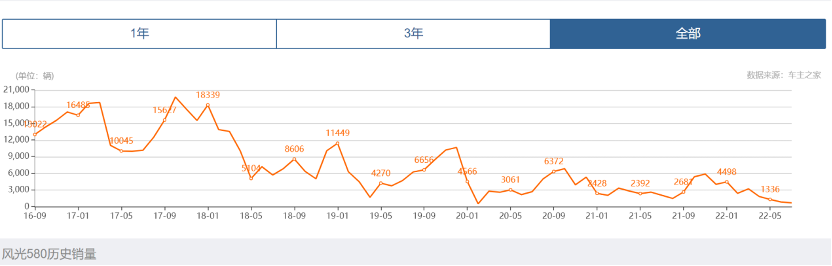 从2018年年开始,东风小康的主力车型风光580的销量便开始“跌跌不休”,从单月*上万辆的销量,跌至如今每月仅有千余辆销量。