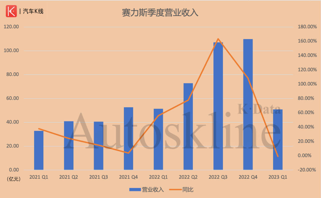 首先来简单回顾赛力斯2023年第一季度经营情况。财报显示,赛力斯一季度实现营收50.91亿元,较2022年同期同比微降0.79%,较前一个季度环比骤降53.64%。