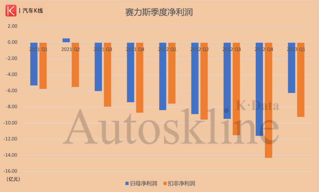 与营收和销量相比,更引人关注的是赛力斯的盈利情况。财报显示,赛力斯2023年第一季度归属于上市公司股东的净利润(以下简称“归母净利润”)为亏损6.25亿元,亏损程度同比收窄25.49%,环比2022年四季度更是收窄了45.98%。