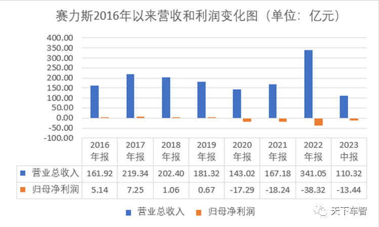 根据中报披露,今年上半年,赛力斯营收110.32亿元,同比减少11.14%,归母净利润13.44亿元,扣非归母净利润亏损18.85亿元。如果将时间拉长,2020到2022年,赛力斯扣非后分别亏损23亿元、28亿元、43亿元,亏损额度在增加。