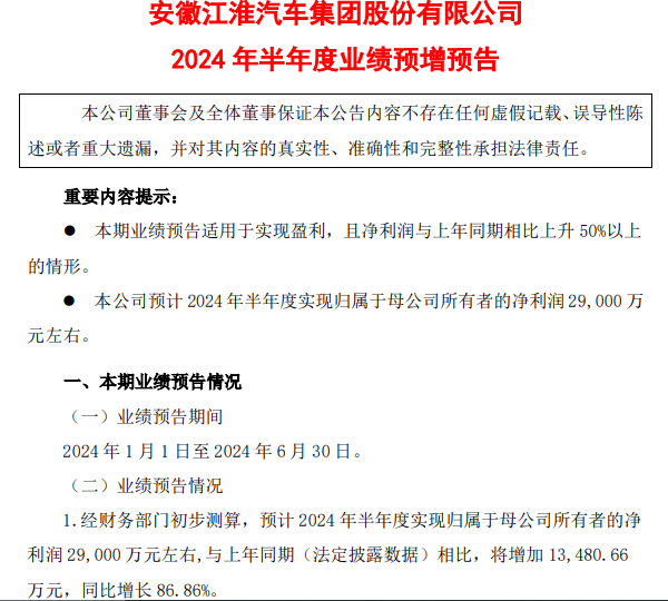 江淮汽车的业绩预增预告披露,经财务部门初步测算,预计该司2024上半年度实现归母净利润2.9亿元左右,与2023年同期(法定披露数据)的1.55亿元相比,将增加1.35亿元左右,同比增长高达86.86%。