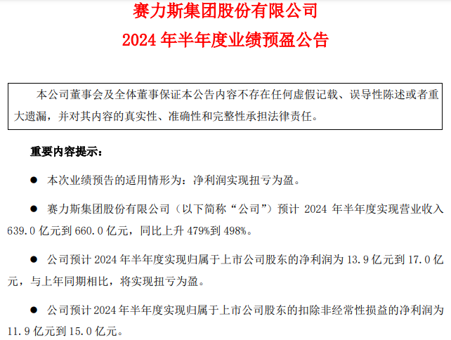 根据赛力斯的业绩预盈公告,2024上半年,赛力斯实现了净利润的扭亏为盈。