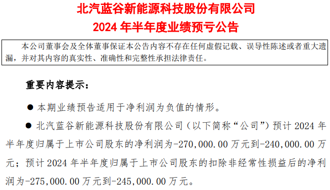 北汽蓝谷的业绩预亏公告披露,预计2024上半年归属净利润为-27亿元到-24亿元。