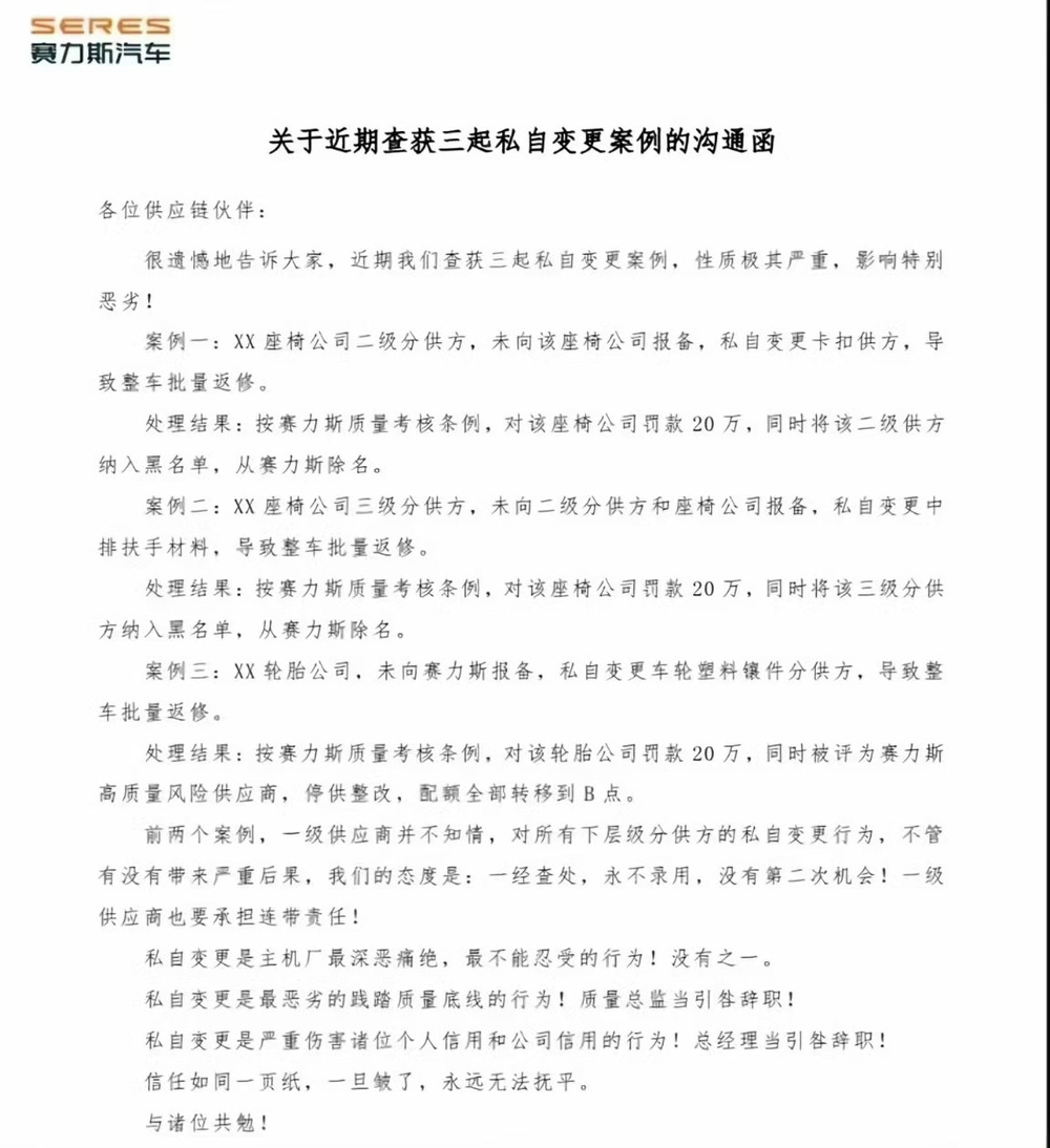 公示称,前两个案例,一级供应商并不知情,对所有下层级分供方的私自变更行为,不管有没有带来严重后果,公司的态度是:一经查处,永不录用,没有第二次机会,一级供应商也要承担连带责任。