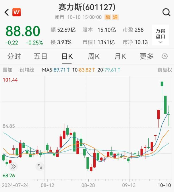 截至10月10日收盘,赛力斯每股报88.80元,最新市值为1341亿元。