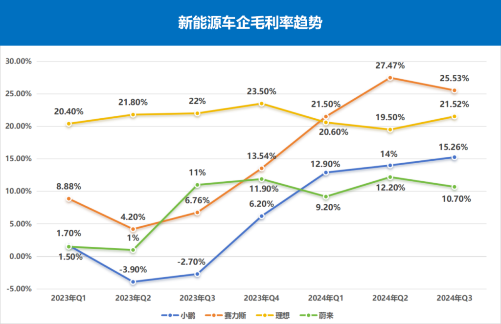 同时,毛利率的不断提升,也从另一侧面印证了赛力斯对成本的控制以及良好的经营能力。赛力斯三季度整体毛利率高达25.53%。相比之下,理想三季度毛利率21.52%,仍处于亏损中的小鹏、蔚来第三季度毛利率分别仅为15.26%、10.7%。业内分析认为,随着生产规模的扩大和市场份额的提升,赛力斯在降低成本、提高运营效率方面的优势将更加明显。