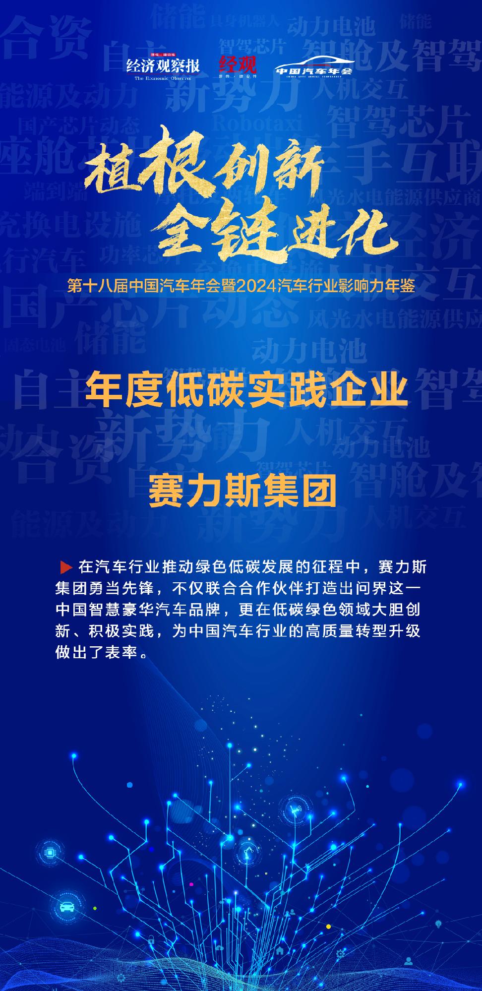 在第十八届中国汽车年会中,赛力斯集团收录2024汽车行业影响力年鉴“年度低碳实践企业”。