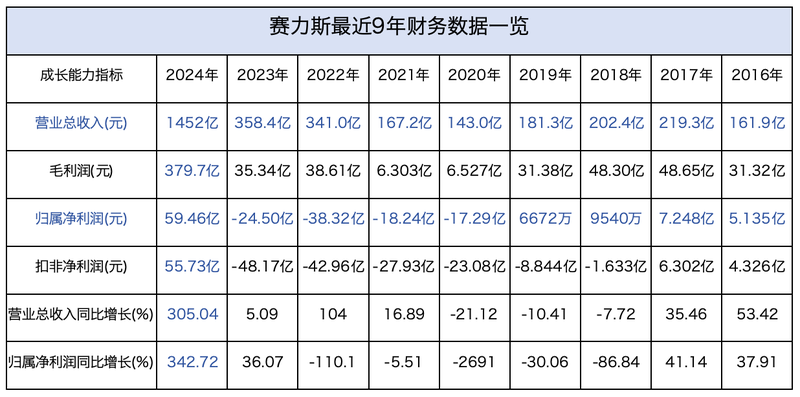 赛力斯在2024年营收、利润双丰收,其中营收1451.76亿元,同比增长305.04%,净利润59.46亿元。