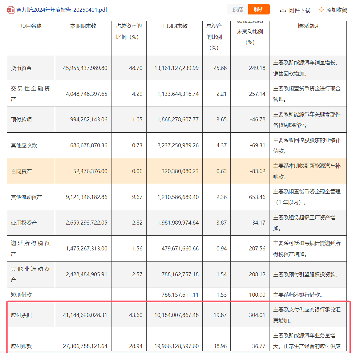 另一方面,赛力斯的应付票据账面价值为411亿元,同期应付账款账面价值为273亿元。这一庞大的数字背后,是企业在供应链环节所面临的巨大压力。然而,高额的应付款就像一把高悬的达摩克利斯之剑,随时可能给企业带来风险。