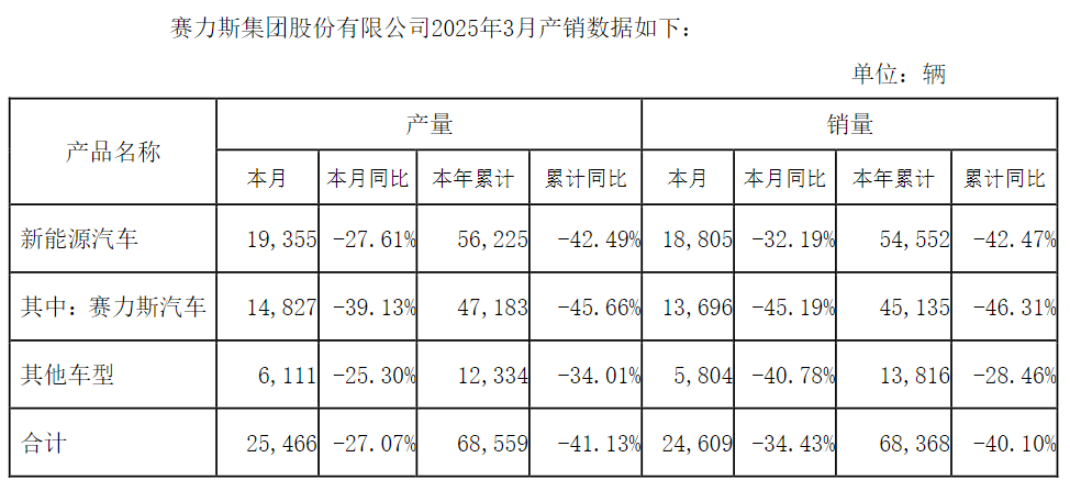 4月3日,赛力斯发布3月产销快报,当月新能源汽车销量为18805辆,同比下降32.19%,其中赛力斯汽车销量为14827辆,同比下降45.66%;1-3月新能源汽车累计销量54552辆,同比下降42.47%,其中赛力斯汽车累计销量45135辆,同比下降46.31%。