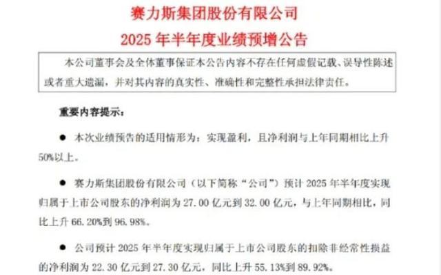 7月10日晚间,赛力斯发布的2025年半年度业绩预增公告在资本市场投下一枚“深水炸弹”。在整体销量下滑15.77%的背景下,公司预计上半年归属于上市公司股东的净利润达到27亿元到32亿元。