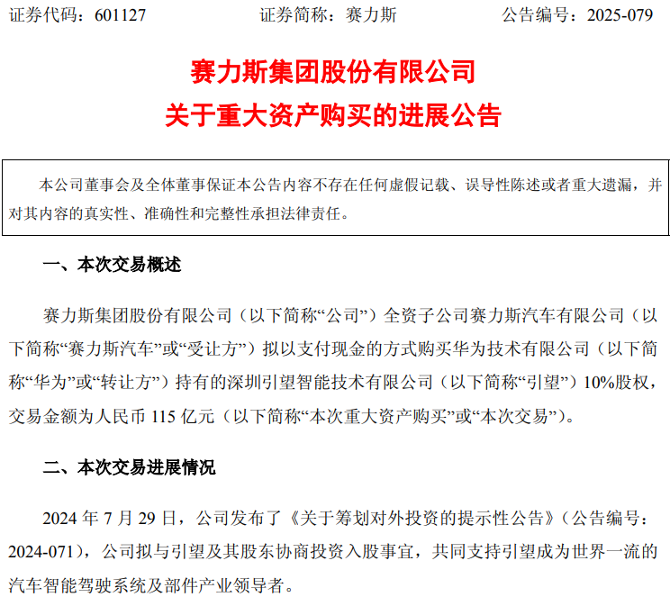 根据公告,赛力斯汽车有限公司以支付现金的方式购买华为技术有限公司持有的深圳引望智能技术有限公司10%股权,交易金额为人民币115亿元。引望智能是华为在智能驾驶领域的重要布局,该公司专注于汽车智能驾驶系统及部件的研发与产业化。赛力斯在公告中表示,此次交易旨在“共同支持引望成为世界一流的汽车智能驾驶系统及部件产业领导者”。