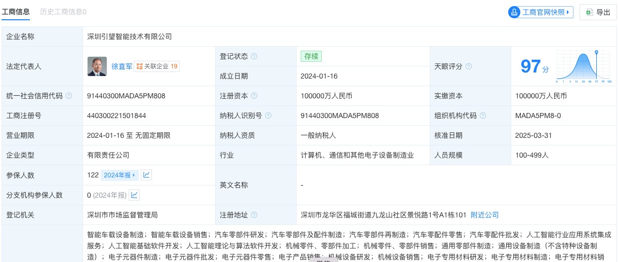 天眼查显示,引望成立于2024年1月16日,注册资本为10亿元,从事汽车智能系统及部件解决方案研发、设计、生产、销售和服务,主要业务范围包括汽车智能驾驶解决方案、汽车智能座舱、智能车控、智能车云、车载光等。