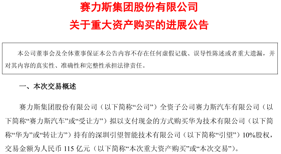 2024年8月25日,赛力斯发布公告称,2024年8月23日,公司第五届董事会第十五次会议同意赛力斯汽车以支付现金的方式购买华为技术有限公司持有的引望10%股权,交易金额为115亿元。