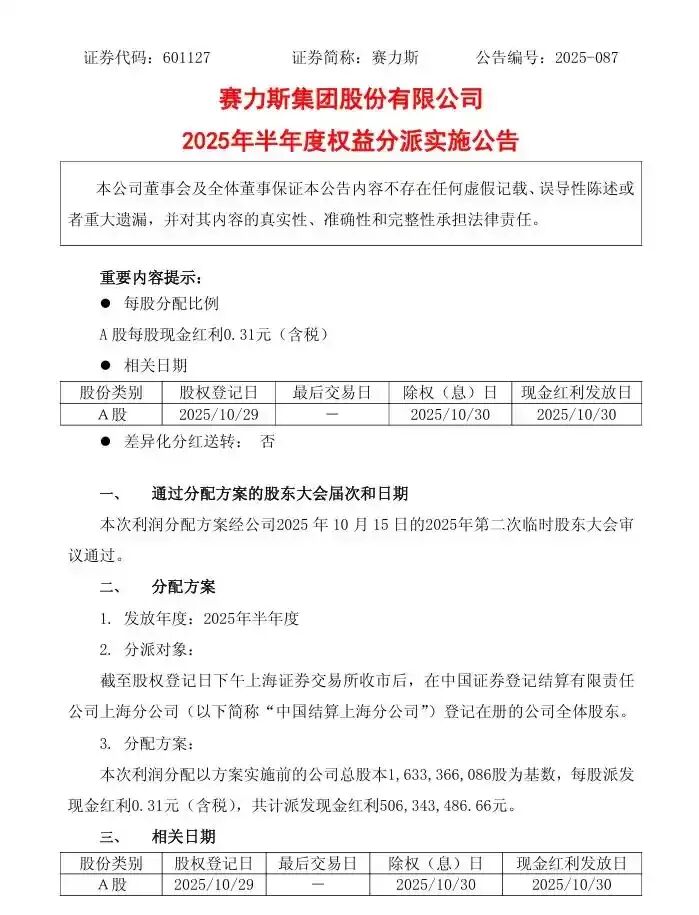 赛力斯近日公告称,2025年半年度权益分派方案已获2025年第二次临时股东大会通过。本次利润分配以总股本1,633,366,086股为基数,每股派发现金红利0.31元,共计派发现金红利5.06亿元。